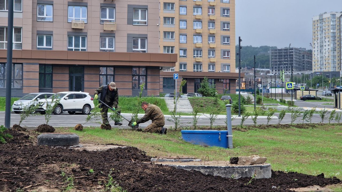 УК "Зеленый бульвар" создает зеленую изгородь (кусты кизильника блестящего) на границе парковки дома Сочинская 12