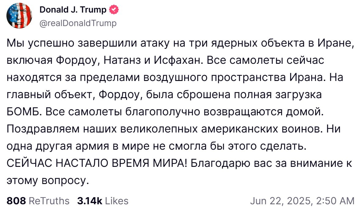 «Полный комплект бомб был сброшен на основной объект, Фордо. В мире нет других военных, которые могли бы сделать это», — отметил Трамп.