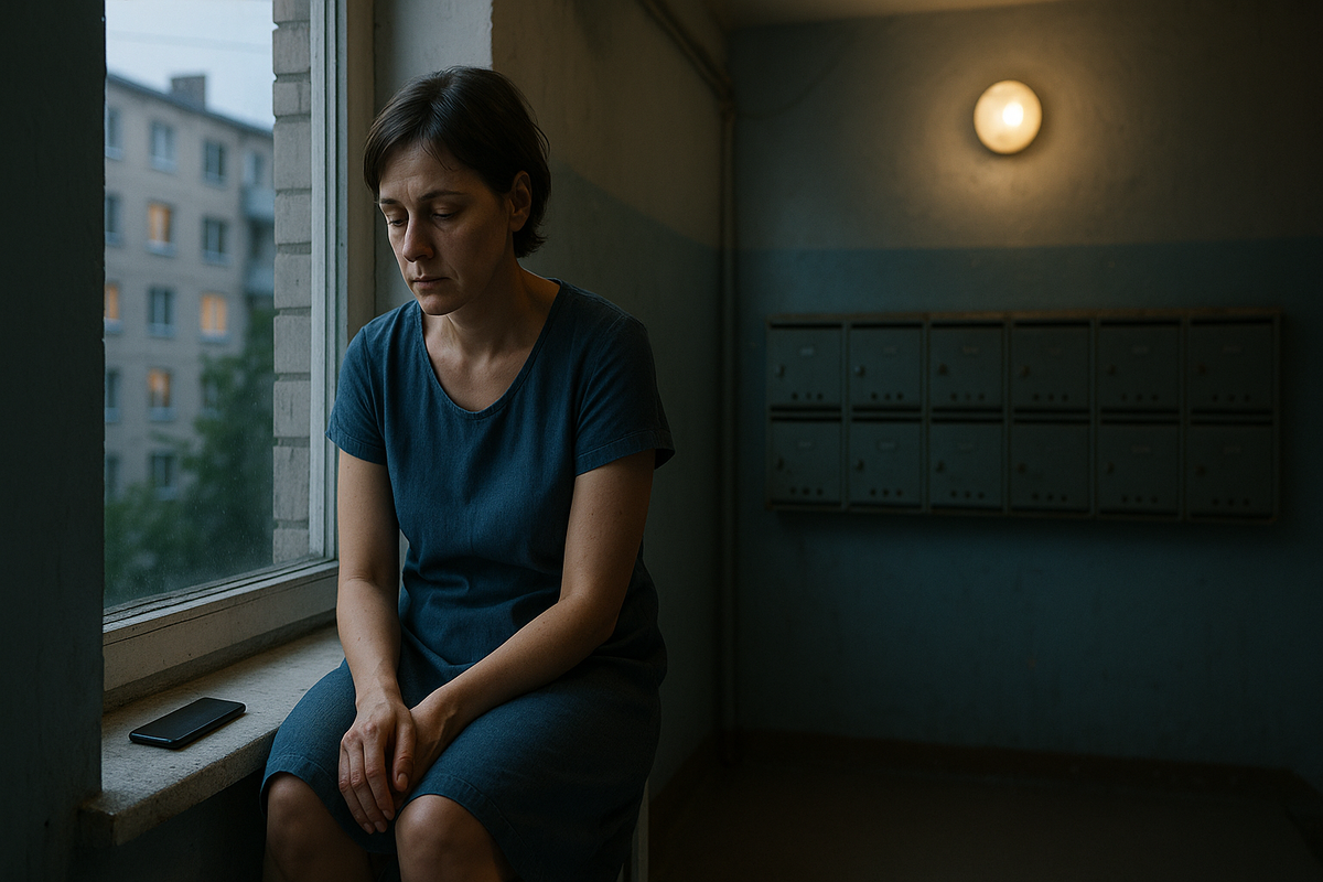 Она не отвечает. Выходит из квартиры, закрывает дверь. Спускается на первый этаж, садится на подоконник в подъезде.