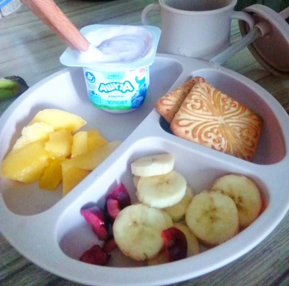 Завтрак для ребенка в 8 месяцев может состоят из молочной или безмолочной каши (гречневой, рисовой, овсяной) на воде или грудном молоке, объемом 100-150 мл, с добавлением 50 мл фруктового пюре (яблоко, груша, банан). Сегодня у Парвинки☺️ была манная каша без добавок. ❤️👀:на фото у Парвинки второй завтрак просто фрукты и творожок #Агуша🚼 Также можно добавить 5 г печенья. В этот период можно вводить в рацион кисломолочные продукты, такие как творог или кефир, а также вареный желток. Примерное меню: Каша: 100-150 мл каши (гречневая, овсяная, рисовая) на воде или грудном молоке. Фруктовое пюре: 50 мл пюре из яблок, груш или бананов. Дополнительно: Печенье (5 г), творог, кефир, вареный желток. Важно следить за реакцией ребенка на новые продукты и вводить их постепенно. 🚼💛🚼 #владивосток #прикорм #ребёнок #декрет