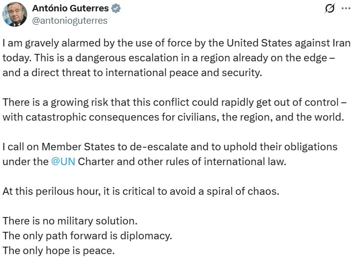 UN chief 'gravely alarmed' that Trump bombs Iran