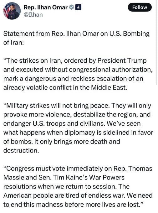 Trump's unauthorized Iran strikes 'endanger' US troops & civilians — Congresswoman Omar