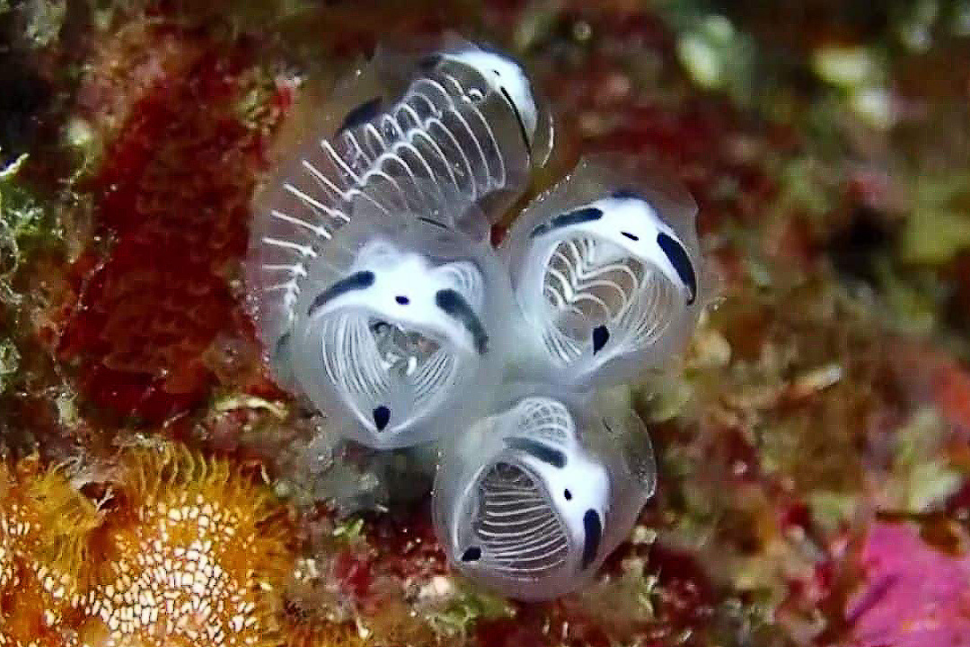 Привет, мои дорогие любители необычной земной фауны. Герои этого выпуска буквально "взорвали" интернет, когда в сети появились первые изображения этих удивительных существ. Как их только не называли: зомби-рыбами, ожившими скелетами рыб, и даже скелетами-пандами. Что это на самом деле такое? Фотографии этих существ появились ещё в 2017 году. Японский дайвер Судзи Терай, имеющий небольшой дайв-центр на острове Куме архипелага Рюкю (южная часть Японии, близкая к Тайваню) сфотографировал этих созданий и привлекал к себе дайверов, организовывая туры к местам их обитаний. Его клиенты, естественно, делились своими кадрами, которые быстро вирусились в сети, и в какой-то момент привлекли внимание морского биолога Наохиро Хасэгавы, который опознал в животных неизвестный вид асцидий. Он собрал деньги на краудфандинговом сайте и организовал экспедицию, в которой ему удалось получить образцы, которые были позже описаны. Это действительно оказались асцидии, примитивные хордовые животные, наша даль
