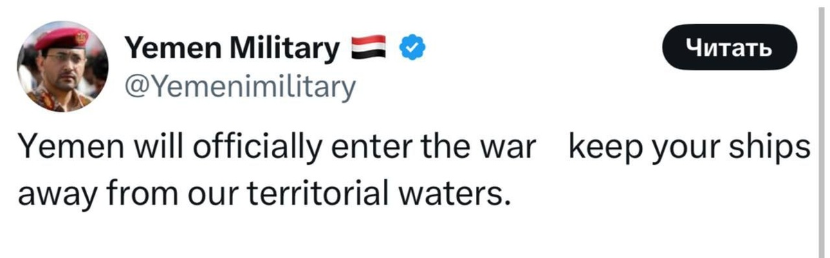 ⚡️Йемен объявил о готовности вступить в войну против Израиля и США.