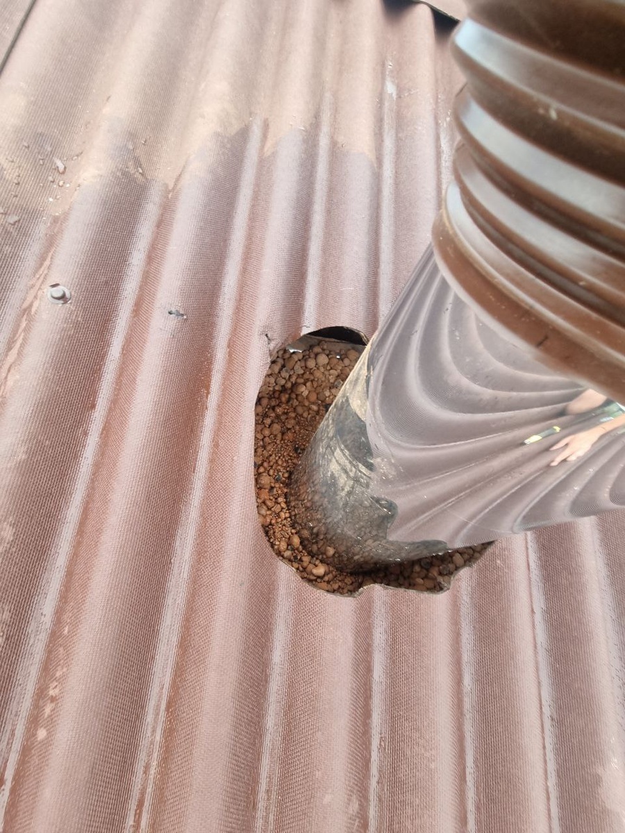 Засыпал керамзит в потолочном проходе трубы для теплоизоляции как негорючий материал. Снизу подшил лист нержавейки.