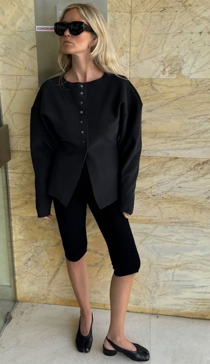 Рубрика: удивительно, но работает Очень зацепил этот тотал блэк образ. Он построен на контрасте и повторении одновременно. Давайте разберем Объем сверху (в виде то ли рубашки то ли пиджака без ворота) балансирует с обтягивающим низом. Скинни капри - вещь красивая, но опасная - режет даже тоненькие длинные ноги. И как будто хочется их сразу удлиннить, например, слингбэками. Но тут, неожиданно - таби!) И как же здорово они перекликаются с округлыми очками в крупной оправе! Ну красота. А вам как образ?