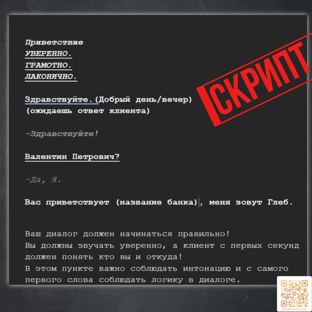❗️Мы разобрали скрипт (или сценарий) действий мошенников, которым пользуется один из зарубежных кол-центров. Данный сценарий предназначен для первого этапа мошеннической схемы или для, так называемого, «холодного звонка». ❓Как это работает (по скрипту мошенников): 🔣Вход в доверие Звонок начинается профессионально: «Здравствуйте. [Ваше Имя Отчество]? Вас приветствует ваш банк, меня зовут [Имя оператора, например, Глеб].» Уверенный тон, знание ФИО гражданина – создают иллюзию легальности. 🔣Создание проблемы Мошенник сообщает о «подозрительной операции», требующей срочного подтверждения. Чаще всего это: «Смена финансового номера телефона» в вашем банковском приложении (главный предлог в скрипте). Перевод, оформление доверенности, отключение "антивируса" и т.д. Обоснование: «Наш ИИ заметил нехарактерные действия / реквизиты операции в черном списке банка». Например: «Бабушка открыла вклад, а теперь закрывает его онлайн – СТРАННО, НЕ ТАК ЛИ?» 🔣Провокация страха Когда гражданин о