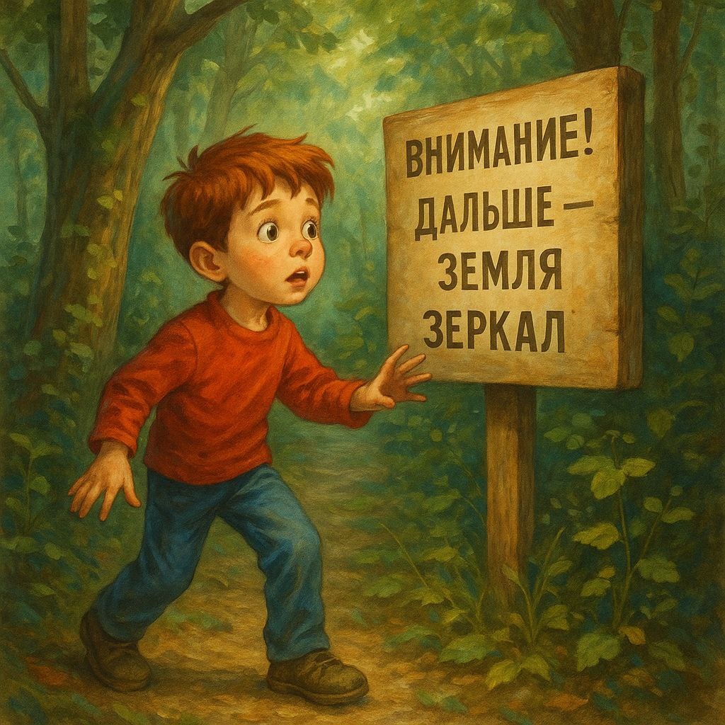 Сказка «Непослушный Роман и таинственный Лес» В одном солнечном городе жил-был мальчик по имени Роман. Он был весёлым, умным и находчивым, но вот беда — ужасно непослушным. Рома никогда не слушал маму, не убирал игрушки, перебивал взрослых и всё время делал наоборот. — Не ходи один в лес, — строго говорила мама. — Почему? Я же всё знаю! — отвечал Роман и только усмехался. Однажды утром, когда все были заняты делами, Роман тихонько вышел из дома и направился к лесу. — Покажу-ка я всем, какой я смелый! — гордо подумал он. Лес встретил его шелестом листьев и щебетом птиц. Всё было необычным, волшебным. Рома шёл всё дальше, пока не наткнулся на табличку: «ВНИМАНИЕ! ДАЛЬШЕ — ЗЕМЛЯ ЗЕРКАЛ!» — Интересно! — воскликнул он и шагнул вперёд. Вдруг земля под его ногами задрожала, и он оказался… в мире, где всё было наоборот! Тут взрослые прыгали в лужи, а дети стояли с серьёзными лицами и делали замечания. Вместо деревьев росли гигантские кактусы из мороженого, а звери читали книжки и носили