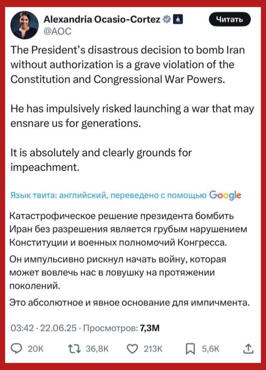 Решение Трампа нанести удары по Ирану без одобрения Конгресса может стать основанием для импичмента, заявляет член Палаты представителей, один из лидеров левого крыла в Демпартии США Александрия Окасио-Кортес на своей странице в Х.