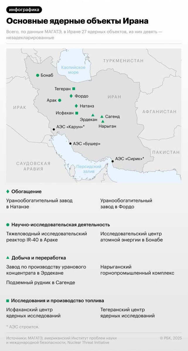 ⚛️ Тегеран продолжит обогащать уран после атаки США на заводы в Натанзе и Фордо, заявила организация по атомной энергии Ирана. В заявлении организации говорится, что Иран не допустит остановки "промышленного развития страны", под которым подразумевается его ядерная инфраструктура. "После жестоких атак сионистского врага в последние дни, сегодня на рассвете ядерные объекты в Фордо, Натанзе и Исфахане подверглись варварскому нападению со стороны врагов Ирана. Это является нарушением международного права, и в частности Договора о нераспространении ядерного оружия (ДНЯО)", – заявили в ОАЭИ. Также организация обвинила в попустительстве и в соучастии Международное агентство по атомной энергии (МАГАТЭ).