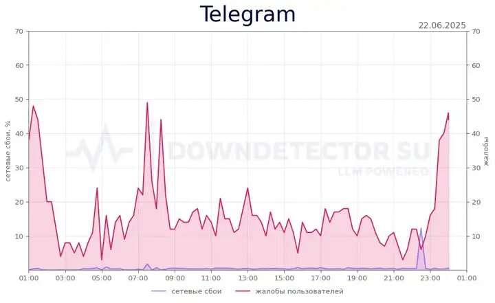 Сегодня ночью Telegram столкнулся с массовыми сбоями, затронувшими пользователей по всей России. Более 2075 сообщений о проблемах поступило за последние сутки, причём свыше 200 – за последний час: это данные на 8:15 утра (ПО МСК) 22 июня. И хотя официальных комментариев от Telegram пока нет, эксперты предполагают, что причиной могла стать перегрузка серверов из-за DDoS-атак или обновления инфраструктуры. Пользователи жалуются на невозможность отправлять сообщения, загружать медиафайлы и открывать приложение как на мобильных устройствах (Android и iOS), так и в веб-версии. Downdetector сообщает, что пик жалоб пришёлся на вечерние часы, когда процент отказов превысил 50%. Проблемы ощущаются особенно остро в Калининградской области (15%) и Москве (14%), на юге России — в Астраханской области (7%). Массовое отключение мессенджера нарушило привычный ритм общения миллионов пользователей. Чат-боты перестали отвечать, платежи через боты задерживаются, а администраторы каналов не могут публиков