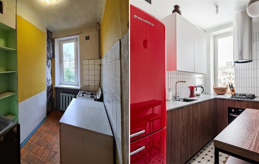 Главный вызов проекта — крошечная кухня площадью 3,5 м². «Это самая маленькая кухня, которую я когда-либо видела», — признается дизайнер. Местные старожилы объясняют такую планировку просто: в советское время на первых этажах размещались столовые, готовить дома не предполагалось.