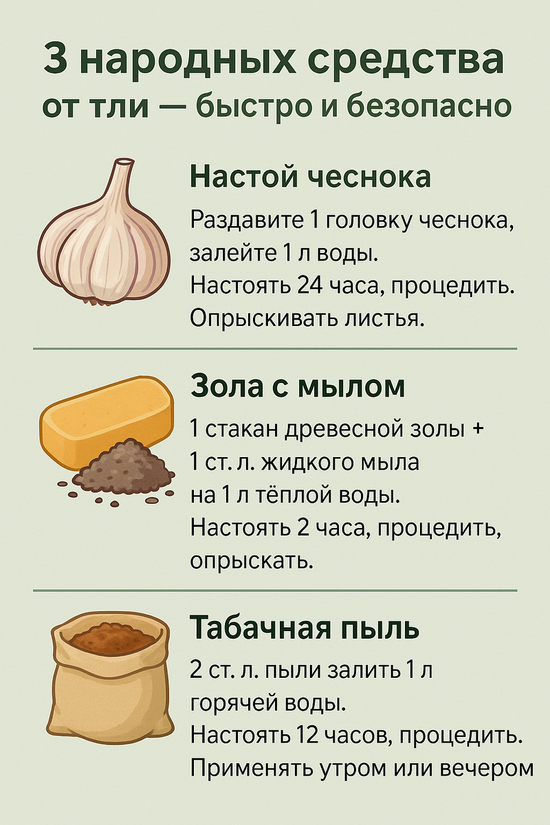 Тля — один из самых распространённых и вредоносных вредителей на вашем огороде и в саду. Она быстро размножается, ослабляет растения, высасывая соки из листьев и побегов, а также переносит вирусные заболевания. Но бороться с ней можно и нужно, и при этом не обязательно использовать агрессивную химию. Народные средства помогут справиться с тлёй быстро, безопасно и с минимальными затратами. Сегодня я расскажу о трёх проверенных рецептах, которые используют опытные дачники, чтобы защитить растения без вреда для себя, окружающих и полезных насекомых. Первое средство — настой чеснока. Чеснок содержит природные фитонциды, которые отпугивают тлю и многих других насекомых. Для приготовления настоя возьмите одну головку чеснока, очистите и измельчите её. Залейте 1 литром тёплой воды, накройте и оставьте на сутки для настаивания. После процедите и опрыскайте растения, уделяя внимание нижней стороне листьев, где часто прячется тля. Настой действует быстро, отпугивая вредителей и укрепляя имму