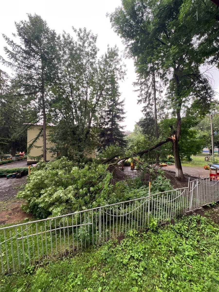 На территории детского сада №193, расположенного на улице Кремлёвской, во время непогоды упало большое дерево. К счастью, обошлось без пострадавших: всё случилось в выходной день, когда детей и воспитателей в саду не было. Напомним, Башгидрометцентр предупредил о неблагоприятных погодных условиях в ближайшие дни. 22 июня пройдут кратковременные дожди, местами с грозами и градом. Ветер юго-западный и западный, умеренный, возможны порывы ветра до 20 м/с. Температура +15…+20°C. 23 июня сохранятся дожди и грозы. Ветер сменится на северо-западный. Ночью столбики термометров покажут +6…+11°C, днём — +15…+20°C.