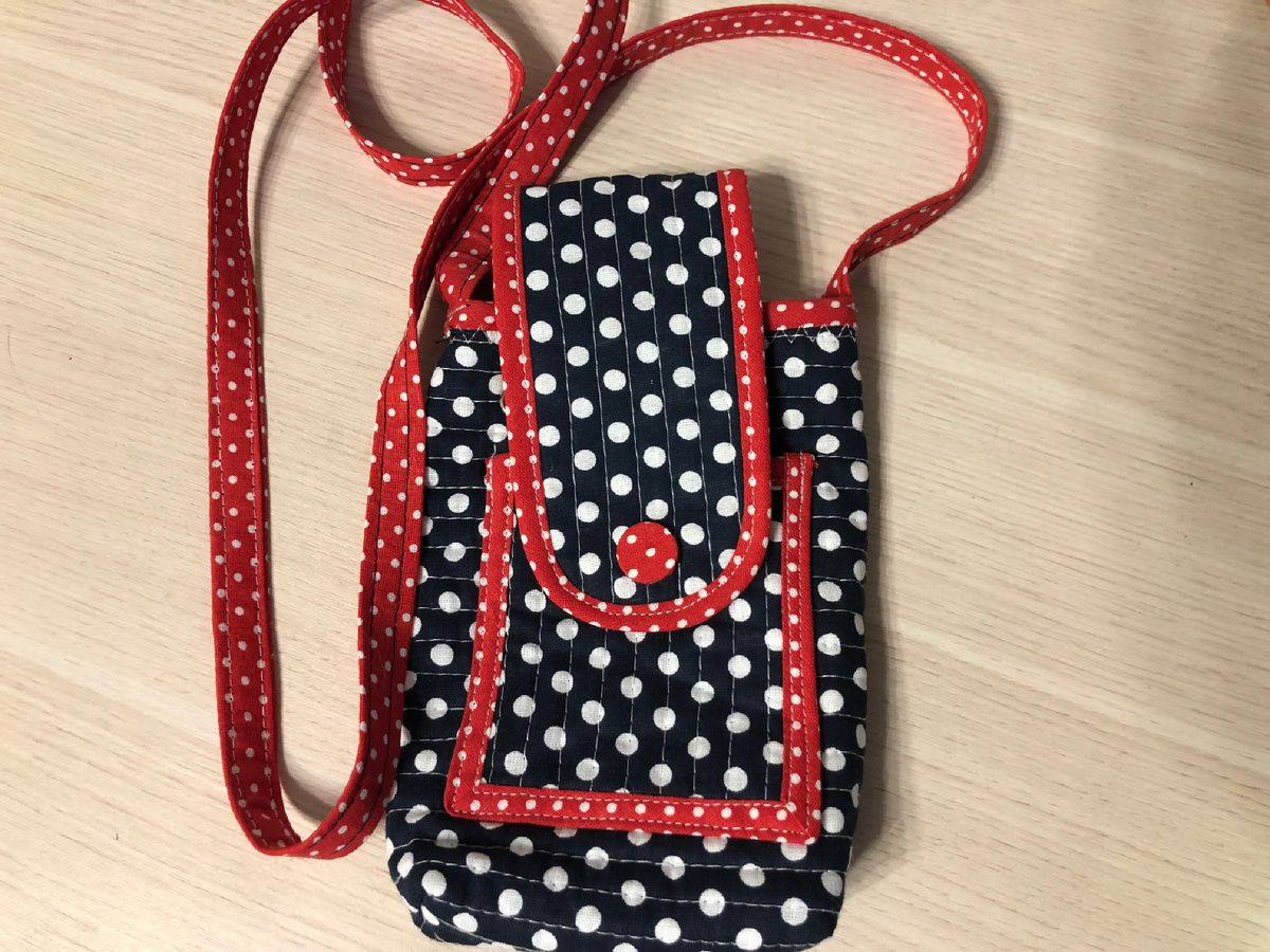 Срочно понадобилась сумочка для прогулок моей маме. В нее должна входить бутылочка с водой, телефон и ключи. Для сумочки я выбрала ткани в горошек, белый крупный на синем фоне и мелкий на красном фоне для окантовки. Так же для прокладки тонкий синтепон. Измерила размер бутылочки, дала небольшие припуски. Стежку сделала прямой строчкой на «лапку». Аналогично сделала карман для телефона и клапан. Карман обтачала бейкой и притачала на основное изделие. Затем стачала сумочку и оформила низ изделия. Все внутренние швы обработала «зигзагом». Верхний край сумочки окантовала бейкой и прикрепила клапан, предварительно окантованый бейкой. Ручку для сумки выполнила из ткани, предварительно вставив внутрь репсовую ленту. Для ключей прикрепила карабин, на клапан прикрепила кнопку. Все вышло быстро, красиво и функционально. Пробуйте и у вас все получится. Спасибо, что дочитали до конца. До новых встреч.