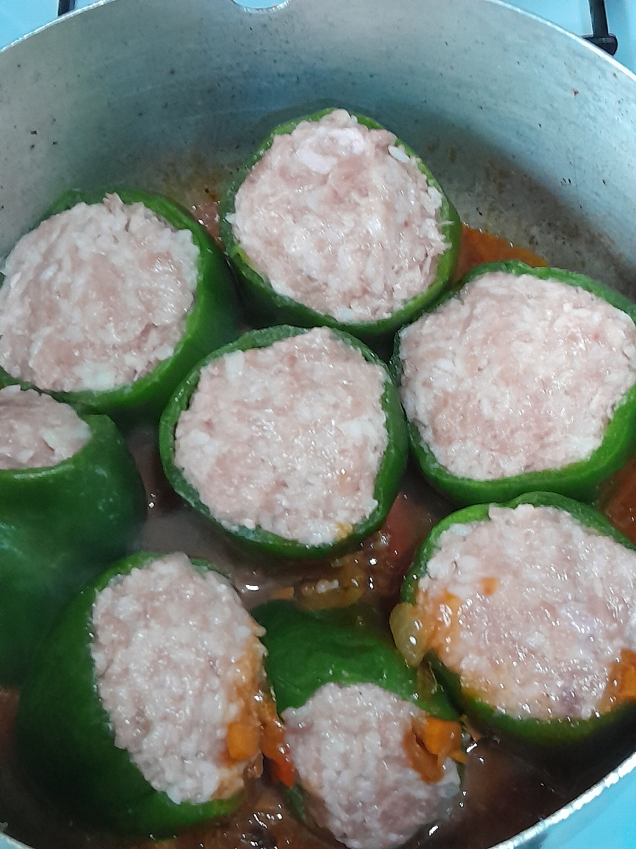 Начиняем перцы фаршем, укладываем в глубокую кастрюлю или сотейник.