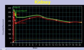 Динамическая нефросцинтиграфия. Часть 1. Динамическая нефросцинтиграфия – это метод визуализации почек, который позволяет оценить их функцию и кровоснабжение. Процедура проводится для диагностики различных заболеваний почек, таких как обструкция мочевыводящих путей, реноваскулярная гипертензия и другие. 💉В качестве радиофармпрепаратов чаще всего используются 99mTC- ДТПА, 99mTC-MAG (Технемаг) или йод-123-гиппуран (используется реже), которые вводятся внутривенно. Подготовка к процедуре: специальной подготовки не требуется. Если пациент принимает мочегонные, то рекомендуется их отменить за сутки до исследования. Процедура начинается с гидратации пациента (около 0.5л воды) и позиционирования его под гамма-камерой. 📈Процедура проводится в 2 фазы: 1-я фаза: сосудистая: производится в течение 1-ой минуты, со скоростью 1 кадр в 2 секунды. Во время данной фазы можно отследить прохождение РФП через брюшную аорту и почечные артерии, т.е. оценить скорость перфузии. В норме пик кровотока в