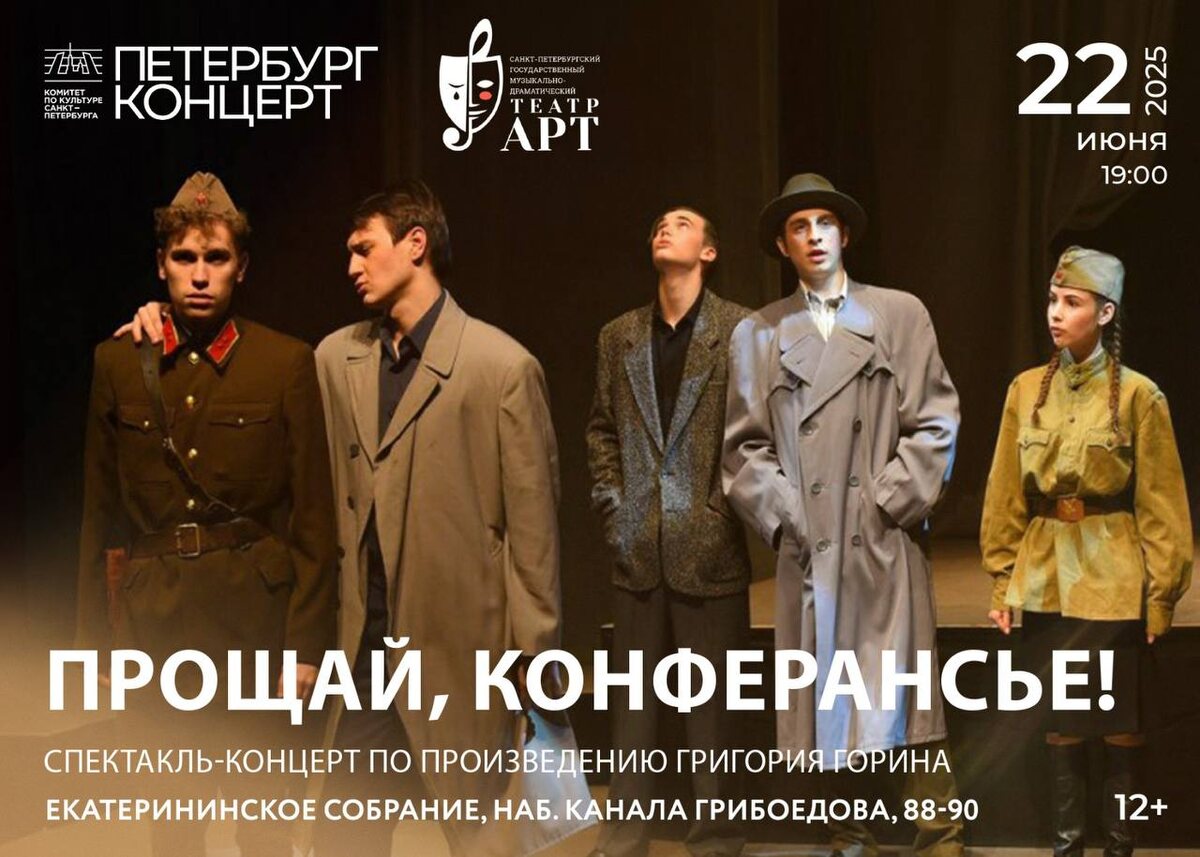 22 июня — день, когда началась Великая Отечественная война. Каждый год в эту важную дату мы отдаем дань памяти всем, кто сражался на фронте и трудился в тылу, кто пережил ужасные испытания. Это время для размышлений о мире, о ценности жизни и о том, как важно помнить уроки истории. Сегодня, 22 июня, в День памяти и скорби, мы приглашаем вас стать зрителями одного из самых пронзительных спектаклей «Прощай, конферансье!». Невероятно светлая и глубоко философская постановка заслуженного артиста России, режиссера «Петербург-концерта» и руководителя Санкт-Петербургского государственного музыкально-драматического театра «АРТ» Александра Исакова по мотивам одноименной пьесы Григория Горина — это история о людях искусства, в жизнь которых ворвалась Великая Отечественная война. В спектакле нет ни великих подвигов, ни сражений, ни торжественных лозунгов. Его герои — обычные люди творческих профессий и именно эти мирные персонажи, попав в плен, проявят лучшие человеческие качества. До встречи