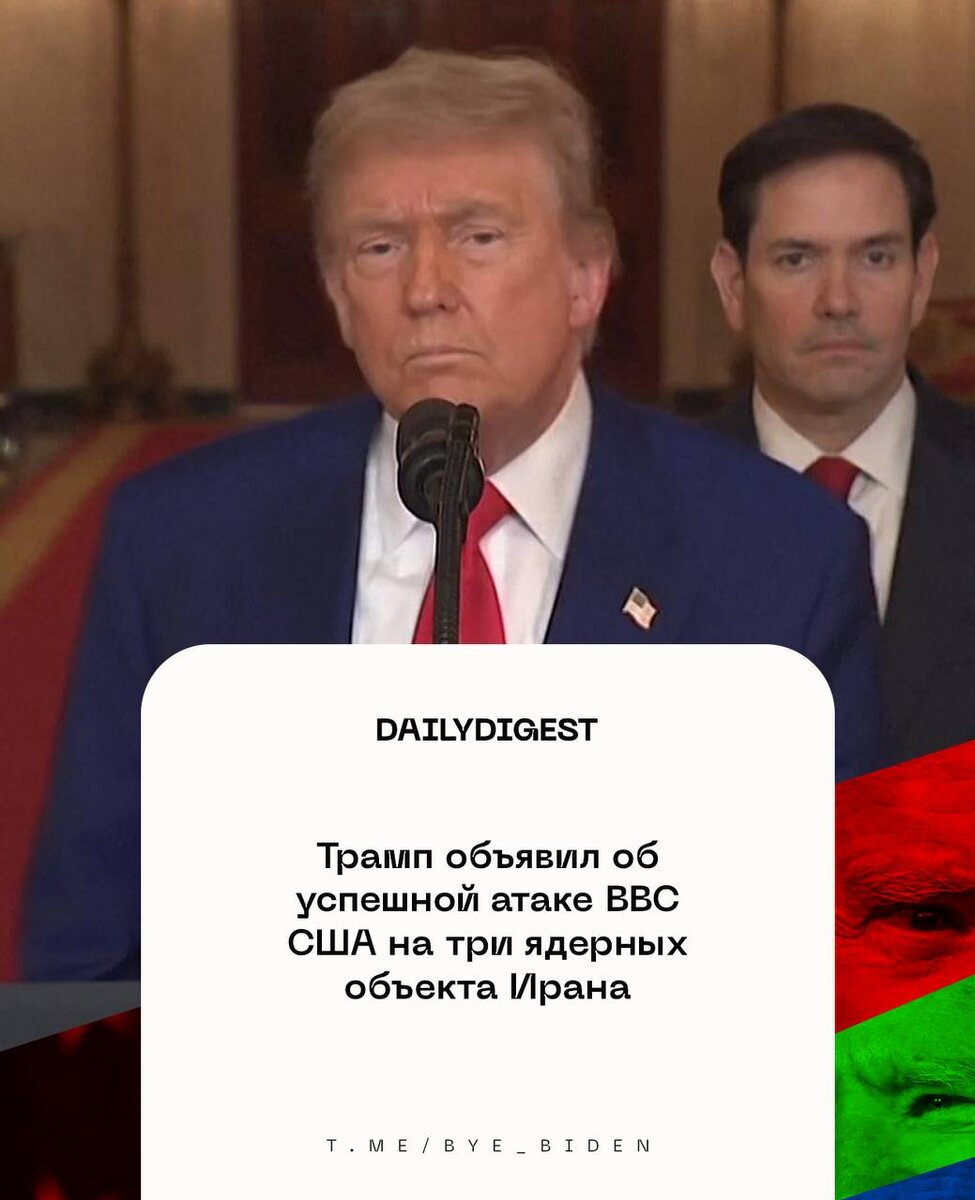 ☑️ Главные новости на утро 22 июня: 🔹Трамп объявил об успешной атаке ВВС США трех ядерных объектов Ирана. 🔹Нетаньяху в обращении к израильтянам после ударов США по Ирану заявил, что его обещание уничтожить ядерные объекты исламской республики выполнено. 🔹Трамп пригрозил Ирану новыми ударами, если он не согласится на прекращение конфликта, передает Reuters. 🔹Национальный центр ядерной безопасности Ирана официально обвинил США в нанесении ударов по объектам в Исфахане, Натанзе и Фордо. 🔹США и Израиль действовали против Ирана в тесном взаимодействии — Трамп. 🔹США нарушили международное право и режим нераспространения ядерного оружия, заявил глава МИД Ирана. 🔹Вашингтон в случае возможного ответного удара Ирана применит еще большую силу, чем при атаке на ядерные объекты, заявил Трамп. 🔹Иран запросил экстренное заседание СБ ООН, сообщает постпредство. 🔹Около 20 немецких политиков и культурных деятелей подали заявление в прокуратуру на Мерца из-за схожести его высказываний с
