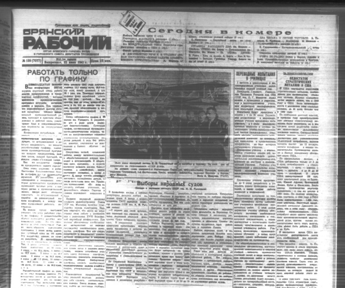 Кроме традиционной всесоюзной повестки на главной странице анонсировали XIV Сессию Брянского городского Совета депутатов трудящихся. Она должна была состояться 26 июня в 19:00 в малом зале Дома Советов. В повестке дня планировалось обсудить итоги 1940-1941 учебного года и подготовку к 1941-1942 учебному году. На заседание были приглашены учителя.