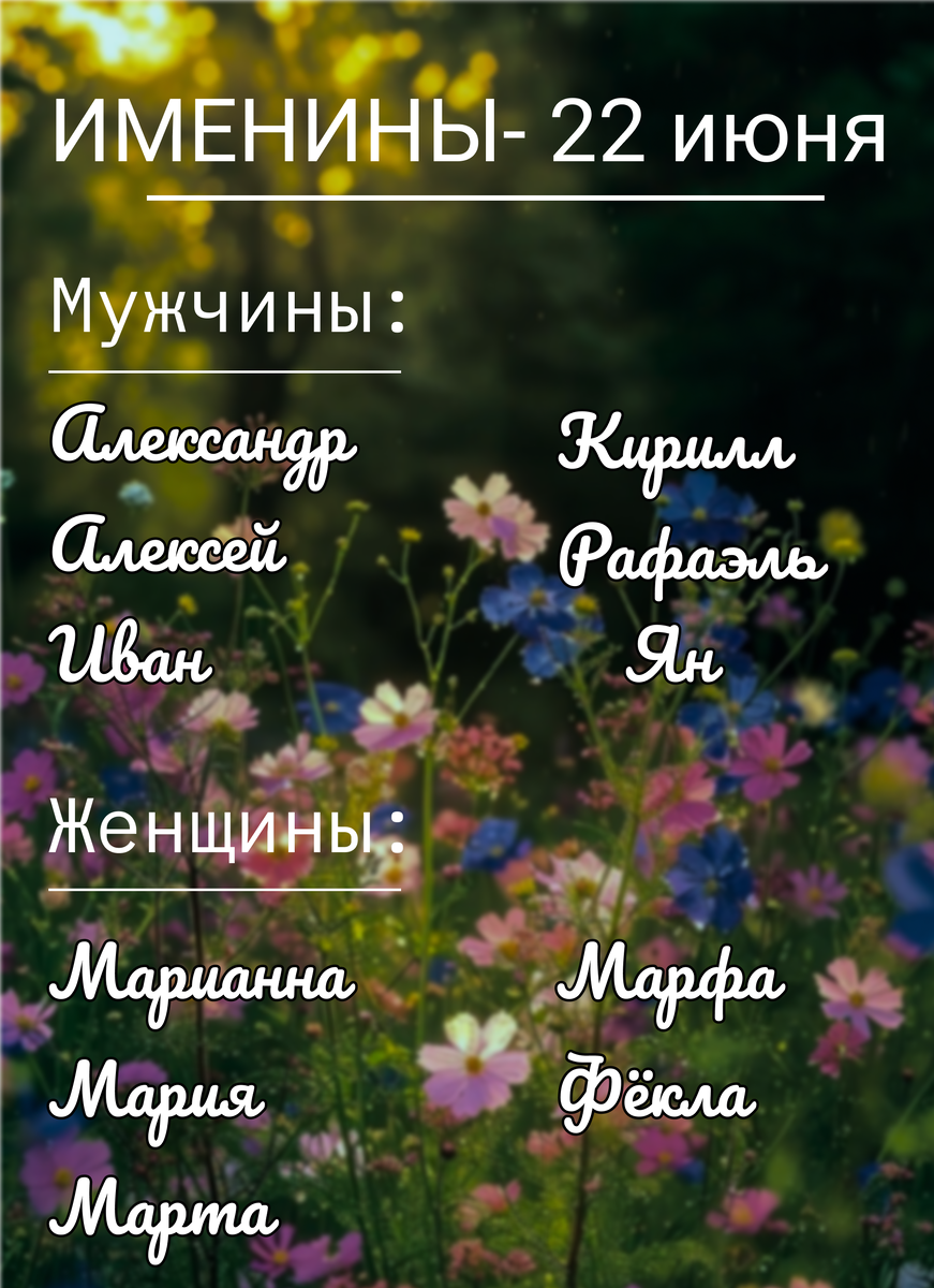 Мужчины: Александр- от древнегреческого имени Александрос, состоящее из: «алекс»- «защищать», «отражать», «помогать» и «андрос»- «мужчина», «человек», «муж». На Руси имя прижилось благодаря появлению святых покровителей, главным из которых стал Александр Невский и означает «защитник людей» или «оберегающий мужей». Алексей- от древнегреческого имени Алексиос, что означает «защитник». Иван- от древнееврейского имени Йоханан- «Яхве милостив», произошедшее от древнеиудейского имени Иоанн- «помилованный Богом». Кирилл- от древнегреческого имени Кюриллос, происходящее от слова «кюриос», что означает «владыка», «повелитель», «господин», «Господь». В переводе с персидского языка означает «солнце». Рафаэль (Рафаил)- от древнееврейского имени Рефаэль, что означает "Бог исцелил". Ян (Жан)- польская, белорусская и древнерусская формы древнееврейского имени Йоханан, что означает «Яхве милостив». Женщины: Марианна- от римского родового имени Марианус, что означает «Мариев», «принадлежавший Марию», к