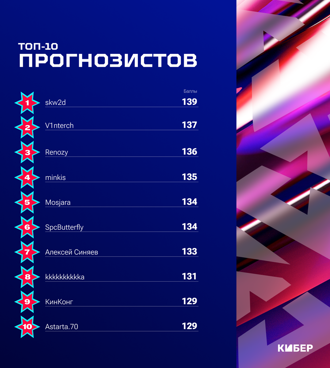 Приз за угаданного MVP турнира: сертификат Озон 5000 рублей и медалька Оракула от Кибера.