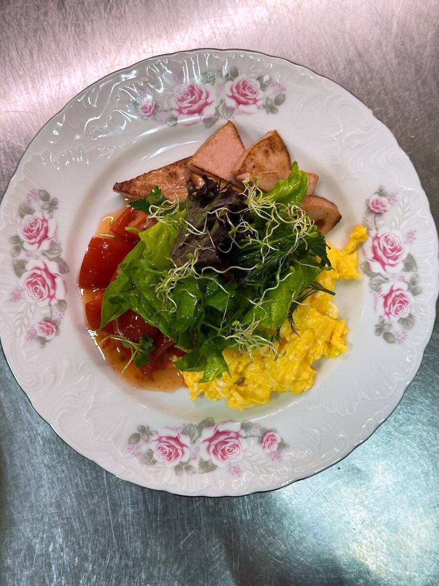 Делаем классический Американский скрембл, обжариваем колбасу до румяного колера, томаты заправляем соусом сладкий Чили, все красиво выкладываем, украшаем салатными листьями и зеленью ( заправка лимонный сок, оливковое масло, соль, перец)