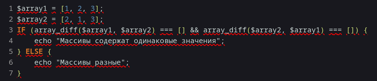 В PHP есть несколько способов сравнить два массива на соответствие в зависимости от того, что именно нужно проверить: $array1 = [1, 2, 3]; $array2 = [2, 1, 3]; if (array_diff($array1, $array2) === [] && array_diff($array2, $array1) === []) { echo "Массивы содержат одинаковые значения"; } else { echo "Массивы разные"; } if ($array1 === $array2) { echo "Массивы полностью идентичны (значения, ключи, порядок и типы)"; } else { echo "Массивы разные"; } if (array_diff_assoc($array1, $array2) === [] && array_diff_assoc($array2, $array1) === []) { echo "Массивы содержат одинаковые пары ключ-значение"; } else { echo "Массивы разные"; } if (array_diff($array1, $array2) === []) { echo "Все элементы первого массива есть во втором"; } if (array_diff($array2, $array1) === []) { echo "Все элементы второго массива есть в первом"; } function arrays_are_equal($a, $b) { return serialize($a) === serialize($b); } if (arrays_are_equal($array1, $array2)) { echo "Многомерные массивы идентичны"; } if (array_d