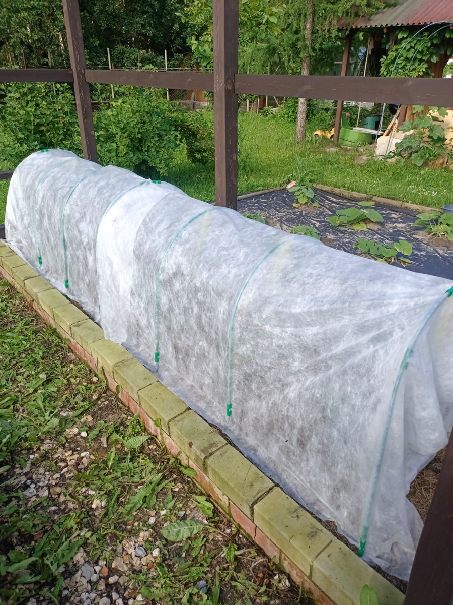 Ближе к вечеру сам стал замерзать и... укрыл огурцы. Чтоб тоже не мёрзли. Надеюсь, пока с метр они вырастут я успею плёнкой покрыть каркас теплицы. Время пошло!