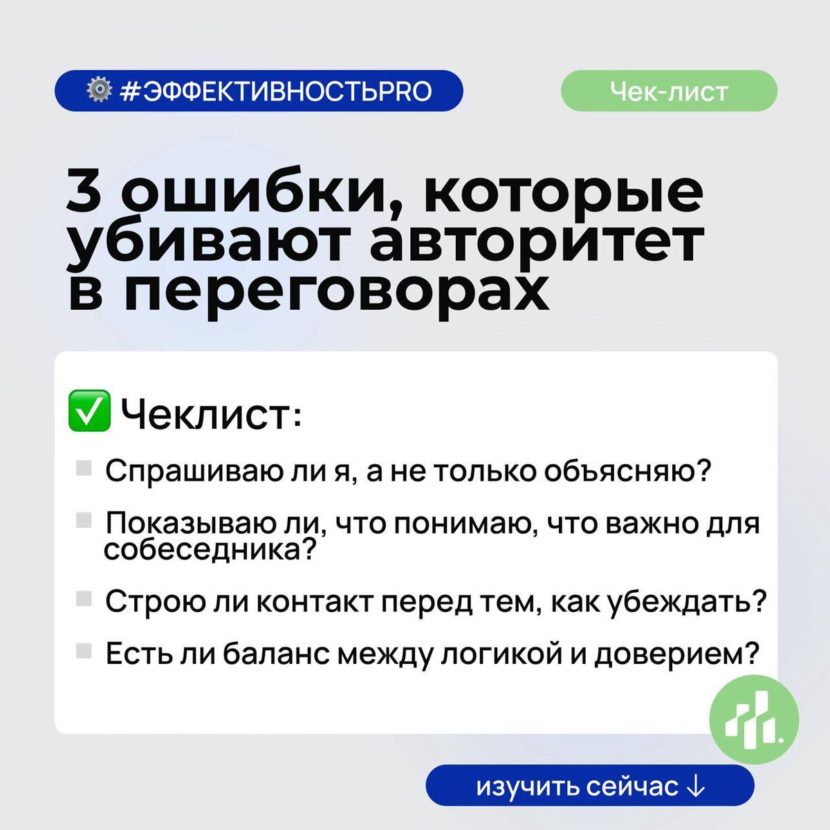 📌 Почему вас не слышат? 3 ошибки, которые убивают авторитет в переговорах Простой чеклист для самодиагностики Вы говорите чётко, аргументированно, даже эмоционально - но результат нулевой. Вас не слышат. Не соглашаются. Не воспринимают всерьёз. ⠀ В 90% случаев причина - не в информации, а в том, как вы её подаёте. И это касается не только слов, но и позиции, поведения, интонации. Проверьте себя по 3 критическим точкам - это типичные ошибки, которые незаметно разрушают ваш авторитет в глазах собеседника: ❌ 1. Позиция «я объясняю, а вы - слушаете» Это выглядит как наставничество, а не диалог. Вы «несёте истину», а не исследуете общую точку зрения. ⠀ 🔸 Что срабатывает лучше: формат совместного поиска — вопросы, уточнения, «давай подумаем вместе», «что ты видишь в этом?». ❌ 2. Преждевременное давление аргументами Когда вы сразу «бьёте фактами», человек чувствует нападение, а не уважение. Даже объективная правда воспринимается враждебно. ⠀ 🔸 Замените это на: установление раппорта, эм