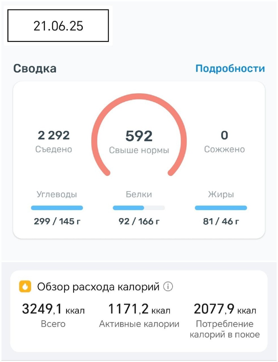 🧐 Итоги вчерашнего дня. 🍔 День похудения: 165 🗓 22.06.25 ⚖️ Вес: 86,35кг ⬆️+0,4 кг😱 💪 Всего скинуто: 25,25 кг 🤔 Выводы дня: 🔸 Мдя... результаты за вчера не утешительные... 🔸 Такое количество сладкого и жирной еды рушит мое похудение безжалостно... 🔸 Сегодня день домашних тренировок 🔸 На улице облачно, по прогнозу +15. 🔸 Спал сегодня 7 часов 46 мин. 🔸 План на утро: Завес, Завтрак ,Интернет рутина, Выгул собак, Машину жены на ТО. 🔸 Планы на ремонт: Нужно приступать к нормальной установке щитка электричества... 🔍 Подробные цифры похудения: (⬇️нажать, чтобы развернуть⬇️) ❌Не в норме: Возраст тела: 37 лет ⬆️+ 1 год😱 ИМТ: 27,3 ⬆️+0,2 😱 Жир(%): 27 % ⬆️+0,4%😱 Жир(кг): 23,31кг ⬆️+0,45 кг😱 Белок: 15,2% ⬇️-0,2%😱 Вода: 50% ⬇️-0,2%😱 Обмен: 1739 ккал ⬆️+ 6 ккал🥳 Висцеральный жир: 12 Кости: 3.2 кг ✔️В норме: Мышцы: 59,8 кг ⬇️-0,1 кг😱 Скелетные мышцы 40,9 % (35,31кг) ⬇️-0,01 кг😱 ✍️ Комментарии к еде: (⬇️нажать, чтобы развернуть⬇️) 🟰За день: -612 ккал ➕Съедено: 229