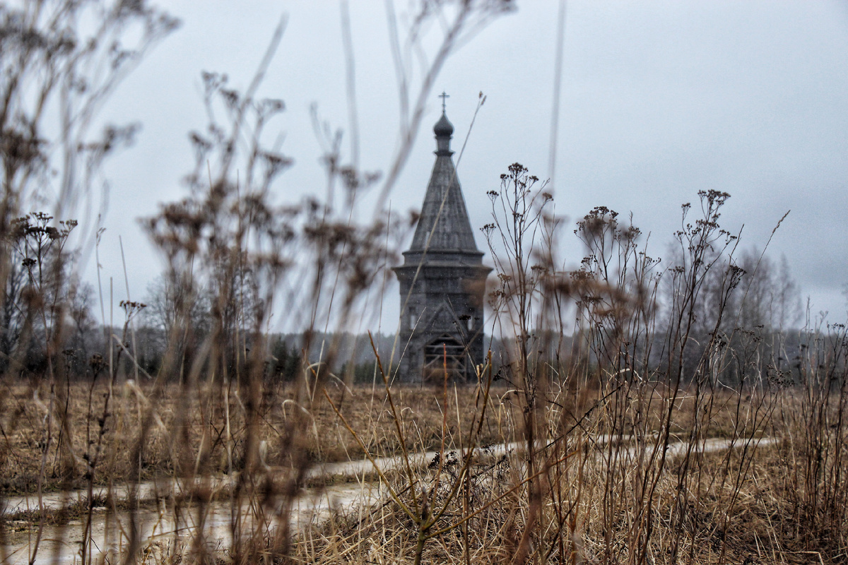 «Никто не живет теперь в Красной Ляге. Среди неширокого окоема, замкнутого в кольцо лесами, среди золотистого поля злаков стоит древний памятник - память почти трех с половиной веков... Ходишь взад-вперед по полевой дороге, отмечаешь, как расчетливо поставлена церковь относительно дорожной оси, как строже становится на удалении силуэт церкви с возносящимся шатром, ощутимее его подлинная древность. И к восторгу примешивается и чувство тревоги за этот одиноко стоящий памятник. Недостаточно охранной доски, необходимо понимание всеми, приходящими сюда, его неизмеримой ценности и красоты.» "Каргополье-Онега" Г.П. Гунн На фото- Михайло-Сретенская церковь, построенная (не падайте!) в 1655 г. на Красноляжском погосте. Подверглась значительной перестройке в 1840-е гг. (были разобраны ветхие боковые галереи-паперти, изменен уровень пола и многое другое), новой перестройке, реставрации и обшивке в 1890-е гг. Это сейчас она одна-одинешенька стоит посреди поля. А раньше… Во-первых, раньше Красн