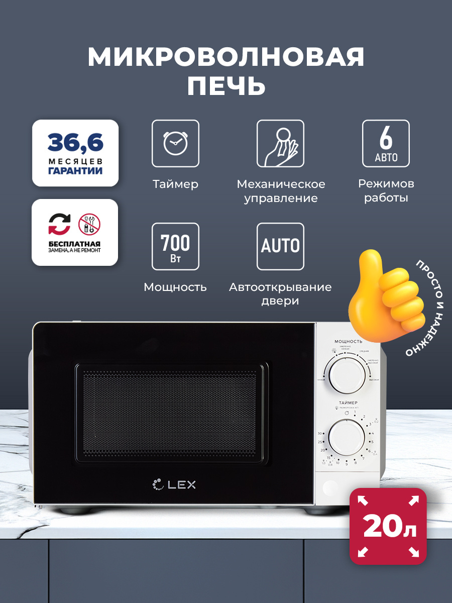 Ищете простую, надёжную и стильную микроволновку для повседневных задач? Модель LEX FSMO 20.01N — идеальный выбор. Эта печь доступна в двух универсальных цветах — классическом белом (WH) и глубоком чёрном (BL). Благодаря лаконичному дизайну и компактным размерам, она органично впишется в интерьер как современной, так и традиционной кухни. Микроволновка выполнена из окрашенной стали и стекла, что придаёт ей аккуратный и современный внешний вид. Белая версия подчёркивает чистоту и минимализм, а чёрная — добавляет строгости и солидности. Оба варианта легко сочетаются с другой кухонной техникой. FSMO 20.01N обладает оптимальными характеристиками для ежедневного использования: Камера микроволновки покрыта антипригарным материалом, что значительно облегчает очистку после приготовления. Просто протрите внутренние стенки — и устройство снова готово к работе. Благодаря своим размерам (243×446×323 мм) и отдельно стоящей установке, микроволновка LEX FSMO 20.01N легко найдёт место даже на небольшо