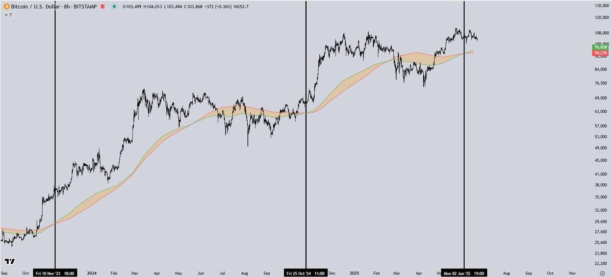 BTC снова на пороге — Золотой Крест срабатывает в третий раз Геополитика снова вмешивается в рынок, и в текущей точке кажется, что булран отменяется. Но, чтобы не впадать в уныние, важно обращаться к цифрам и данным. А данные указывают нам на то, что в текущем булране Bull Market Support Band (EMA+SMA) сформировал Golden Cross всего трижды: — Ноябрь 2023: после чего цена выросла до $75K — Октябрь 2024: импульс привёл к росту до $110K — Июнь 2025: мы находимся ровно в этой точке сейчас Каждый раз пересечение скользящих средних выступало катализатором ускорения тренда. Причём не на пустом месте — после консолидации и подготовки ликвидности. Технически — это один из самых надёжных сигналов на продолжение тренда. Особенно если он происходит на фоне локальной коррекции, как сейчас. Что это значит? История не обязана повторяться, но она часто рифмуется. Если сетап сработает в третий раз — следующая волна может унести цену далеко за $120K. Хотите — сделаю отдельный гайд по Bull Market