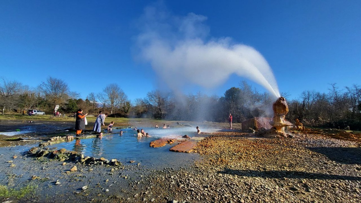 Очамчира встретила нас сумерками и запахом миндаля. Проезжаем поворот на Мокву — и вот он, наш спа-салон под открытым небом: термальный источник, бьющий прямо у дороги. Вода — мутноватая, пахнущая серой, но горячая, как самовар в доме у радушного абхаза.
