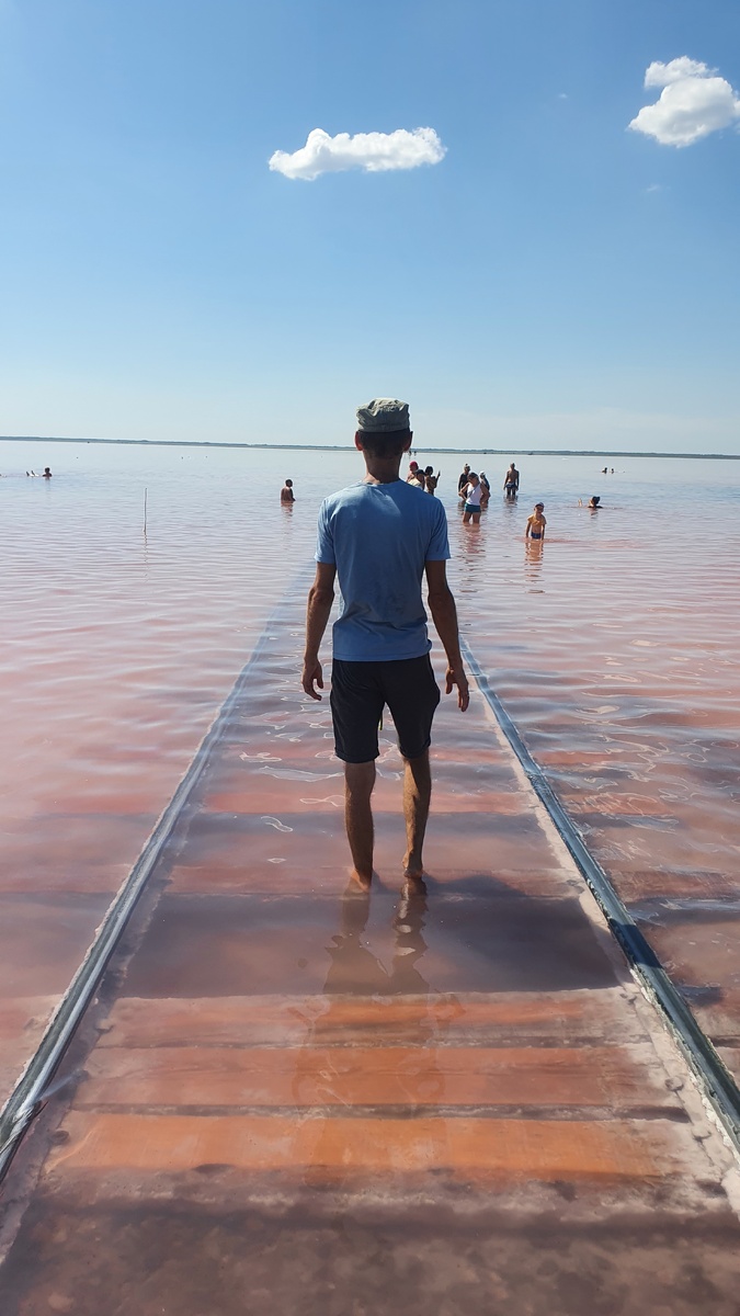 Мы приезжали в июле, стояла невероятная жара! От этого цвет озера был красиво-малиновым. Вода в озере супер соленая и складывалось ощущение, что мы покрылись соленой коркой) Благо на берегу есть пресная вода, которой можно смыть с себя соль)