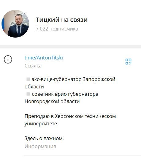 Бывший заместитель губернатора Запорожской области Антон Тицкий, уволенный 15 мая с этой должности, раскрыл своё новое место работы. Как многие и предполагали, он продолжит свою карьеру в «большой России». Ранее на это намекнул даже мэр Энергодара Максим Пухов, сделав приписку к одному из своих постов: «Я так понимаю, что ТГ-канал будет теперь называться «Тицкий в Центре». Именно по трансформации названия телеграм-канала стало понятно, что Антон Робертович действительно занял должность в центральной части страны. Тицкий сменил наименование своего ресурса на «Тицкий в Центре событий», сейчас он называется «Тицкий на связи». В описании к каналу чиновник написал, что он является советником врио губернатора Новгородской области Александра Дронова. Таким образом, Тицкий и раскрыл свою новую должность. Тем не менее, в Новороссии он продолжит бывать часто, так как преподаёт в Херсонском техническом университете. Напомним, ранее выяснилось, что депутаты Запорожского Заксобрания Кувачев и Юрчен