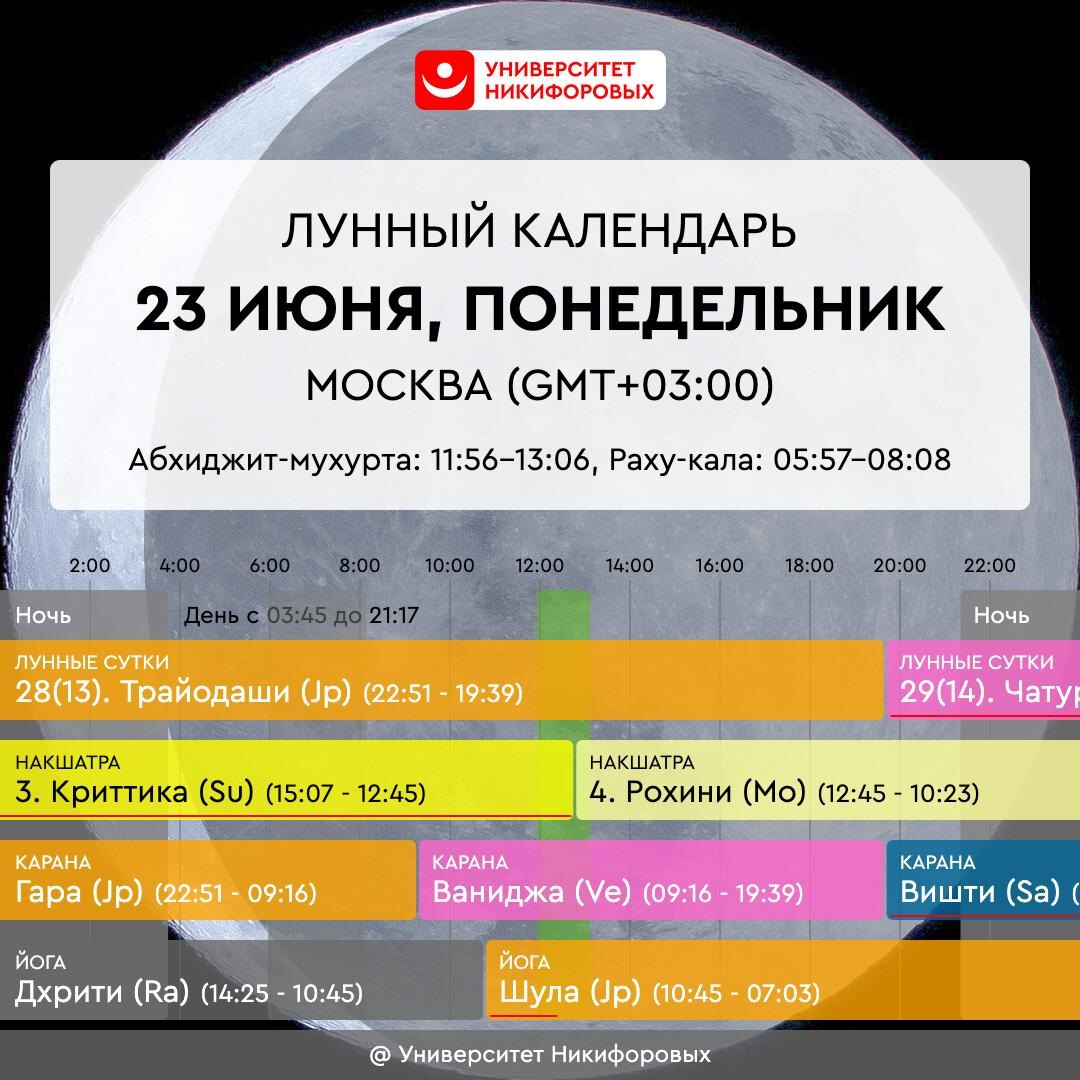 23 ИЮНЯ, ПОНЕДЕЛЬНИК Энергетика дня смешанная, до 10:45 она способна дать устойчивые результаты в делах, требующих мужества и инициативы, проявления лидерских качеств. Можно успешно отстоять свою позицию в споре или отказаться от вредной привычки, поставив это целью. Это также подходящий момент для начала обучения, таких занятий как шитье, вышивка, приготовление пищи. Далее энергии становятся более резкими и могут принести нежелательное и внезапное завершение начатым делам. После 12:45 энергия смягчается, хоть и сохраняет некоторую напряженность. До 19:39 неплохое время для романтики и отношений, можно сходить на шопинг или побаловать себя чем-то приятным. После 19:39 энергия становится жесткой и уже не способствует каким бы то ни было материальным делам, это время для очищения и духовной практики. Хорошо, чтобы ужин был легким и не поздним. Благоприятно вечером зажечь лампадку и прочитать мантру Шиве.