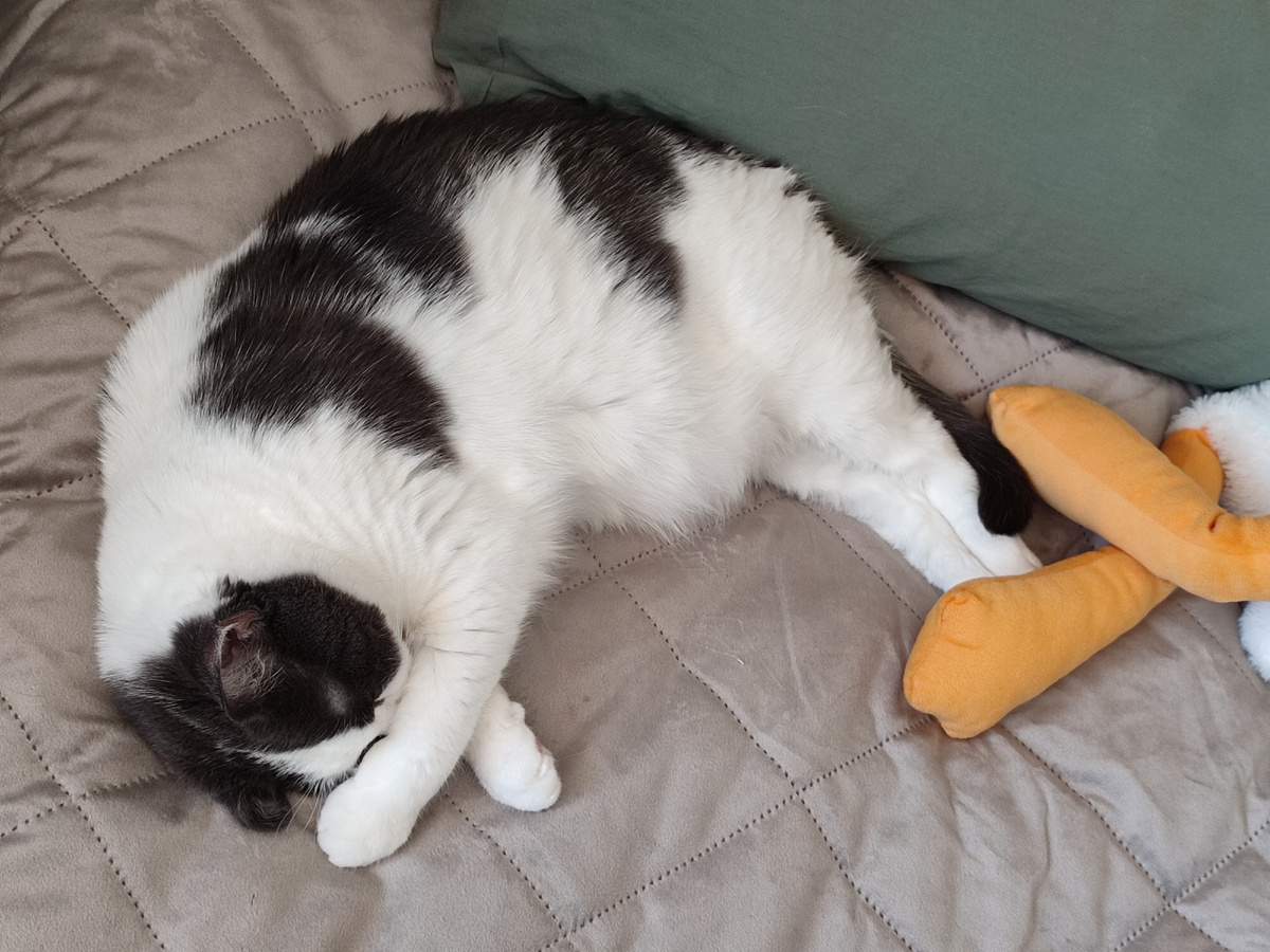 Воскресенье. 22.06.25. Утро снова началось в час ночи, когда Мартыша стала приносить мячики мне в постель)) Ребенок хотел играть. Вчера у пушистой появилось три мячика, которые нашлись на балконе после уборки. Трижды счастливая коша это что-то) Зато утром она просыпаться категорически не хотела. Даже моську лапкой закрывала. Намёки на холод я не понимаю, по прежнему хожу в юбке и футболке. Хотя даже Фёдор сегодня пришёл в куртке и сообщил, что на улице холодно. Но об этом потом. Мартыша и новый плед. Моё, как бы говорит она)) Это её так плющит после футбольной ночи. Два веселых гуся. Умаялись оба. Я сегодня погладила серую скатерть на кухонный стол. Вернее сначала её погладила Сардельковна. А потом уже я. Мне кажется, получилось очень неплохо. Было - стало. Прогулялась до Фикс Прайса. На днях купила на Кемской бокал для шампанского. Один. Долго стояла и думала, брать второй или нет. С одной стороны, незачем. С другой стороны тогда и один незачем) Ну вроде др на носу. Что, я