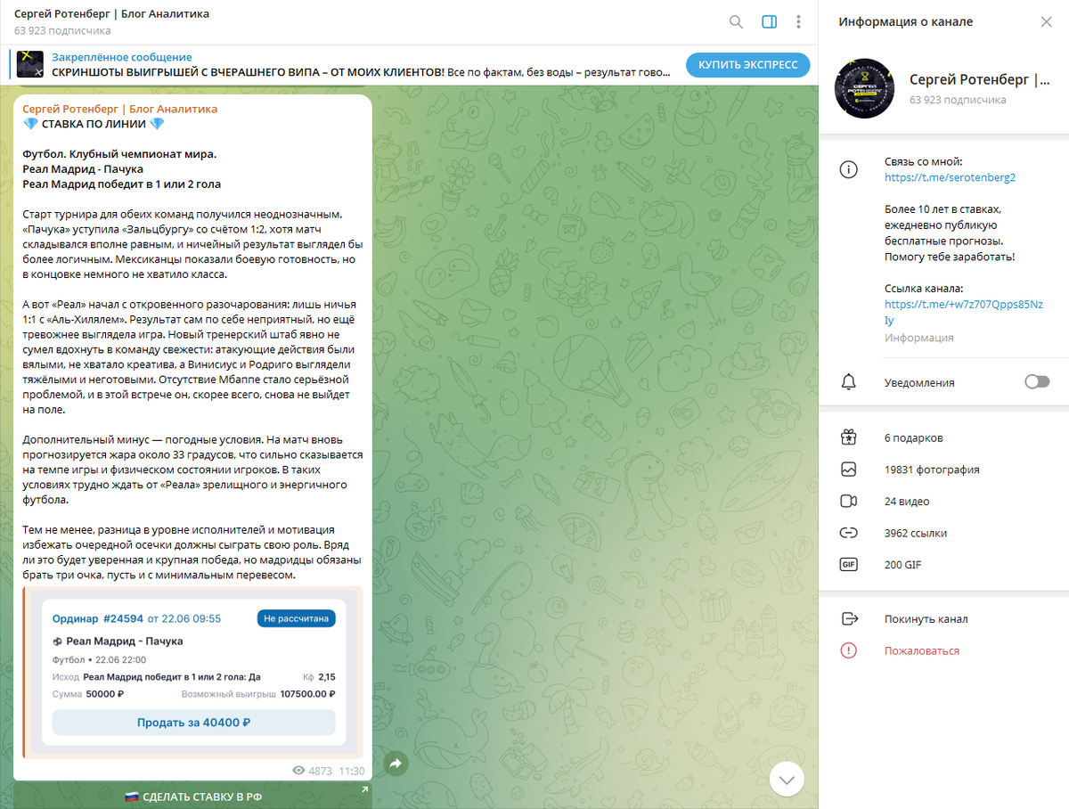 Сергей Ротенберг Блог Аналитика - это каппер в телеграмм, продающий экспрессы с высоким коэффициентом. Мне показалось, что Сергей Ротенберг обманывает свою аудиторию и подделывает статистику.