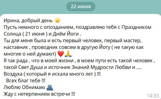Как неожиданно и приятно. Поздравляю всех нас - в каждом из Вас своя особая мудрость, свет, и сила. И так приятны эти касания на уровне сердца с каждым. Недавно в индивидуальном занятии я рассуждала, о красоте йоги, о красоте медитации, о красоте осознанности. Приходя на практику, ты приходишь один, со своим восприятием мира. В процессе практики и общения с теми, кто в этот момент рядом, благодаря инструментам - непосредственно практика - мы приобретаем расширенное восприятие действительности. Происходит взаимно обмен на очень чистых вибрациях. От сюда и весь секрет состояния радости, счастья, силы после занятий.