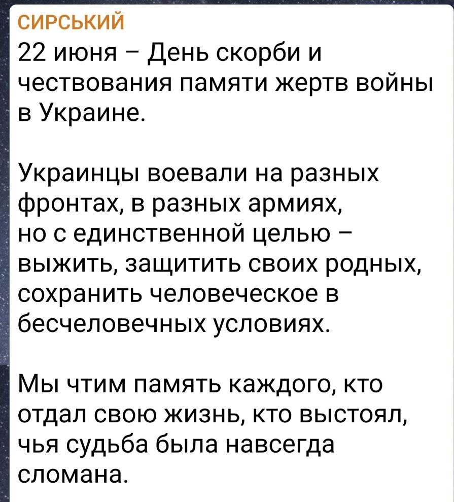 Сенатор от Запорожской области Дмитрий Рогозин назвал главкома ВСУ Сырского проституткой и глистом. Так он отреагировал на неоднозначный пост украинского военачальника, рожденного во Владимирской области, о дне памяти и скорби, дне, когда началась Великая Отечественная война в 1941 году. «Ну, ты ж, проститутка какая! И антифашистскую рыбку съесть, и на фашистский кол сесть...В разных армиях они воевали... "чтоб выжить и защитить своих родных"... Как вы с бабами и детьми воевали, мы знаем. Сжигали их в амбарах живьём. Как вы "выживали" в концлагерях, подрабатывая там тюремщиками и палачами, мы тоже в курсе. "Сохраняли человеческое"... Шкуру вы свою сохраняли, подрабатывая полицаями, затягивая узлы на шеях комсомольцев Краснодона, дробя им кости прикладами», – пишет командир отряда БАРС-Сармат. По его словам, Сырский – изворотливый власовец, который оправдывается за то, чему оправданий быть не может — предательство и военные преступления. Миллионы советских людей из Украины воевали с фаш