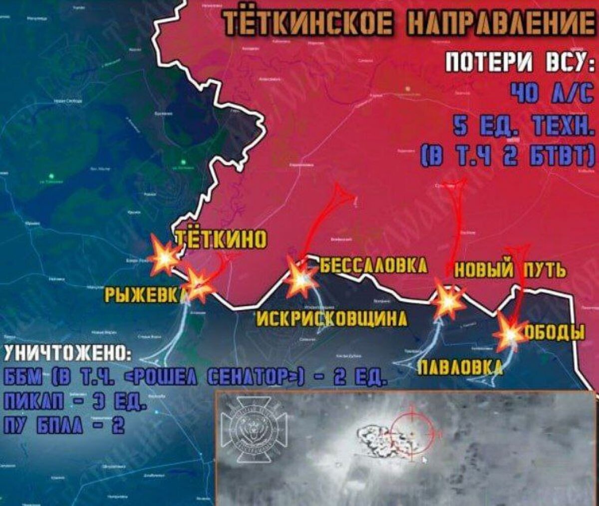 Украинские террористы пытались 10 раз прорваться в Курскую область, однако группировки войск «Север» атаковали передовые и штурмовые отряды ВСУ на Тёткинском и Глушковском направлениях. Кроме того, вражеская сторона не оставляет попыток прорыва на территорию Курского региона небольшими штурмовыми группами. Российские военные, в свою очередь, отразили атаки, уничтожив большую часть сил противника. Всего за минувшие сутки на этих направлениях удалось ликвидировать 5 единиц техники врага. Также ВС РФ уничтожили два пункта управления БПЛА.