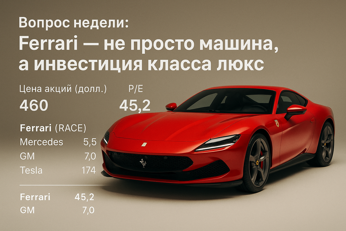 Представьте: вам предлагают любую машину в мире — какую бы вы выбрали? С высокой долей вероятности, у многих первая мысль — Ferrari. Этот бренд давно стал синонимом роскоши, скорости и инженерного совершенства. Конечно, большинство людей вряд ли могут позволить себе личный суперкар с жеребцом на эмблеме. Но есть способ "владеть частью Ferrari" — и это не метафора. С 2015 года Ferrari торгуется на бирже под тикером RACE, и её акции доступны всем желающим. И вот интересный факт: с момента IPO бумаги Ferrari выросли более чем в 17 раз — с $29 до более чем $500 за акцию. Акции бренда стали своего рода люксовым активом: при текущей цене около $460 за акцию коэффициент "цена/прибыль" превышает 45. То есть инвестор платит более чем 45 лет прибыли за одну акцию — довольно смело даже по меркам фондового рынка. Для сравнения: Mercedes торгуется с мультипликатором 5,5, GM — около 7, Ford — чуть выше 8. А вот Tesla, как и Ferrari, — скорее культ, чем просто производитель, — и потому торгуется
