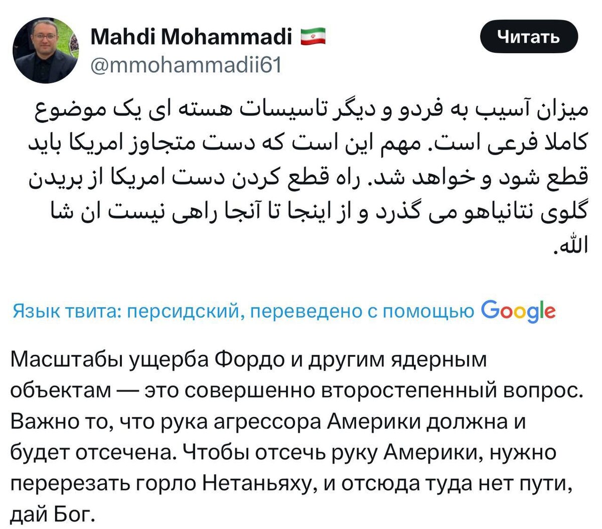 «Ответ Америке неизбежен, первым шагом станет уничтожение Израиля» Старший советник спикера парламента Ирана Мехди Мохаммади призвал «отсечь агрессивную руку» США, а именно — «перерезать горло Нетаньяху». UPD: Россия решительно осуждает атаки США по ядерным объектам в Иране, заявили в МИД РФ. Какие мысли? 👍 БайБайден. Подписаться