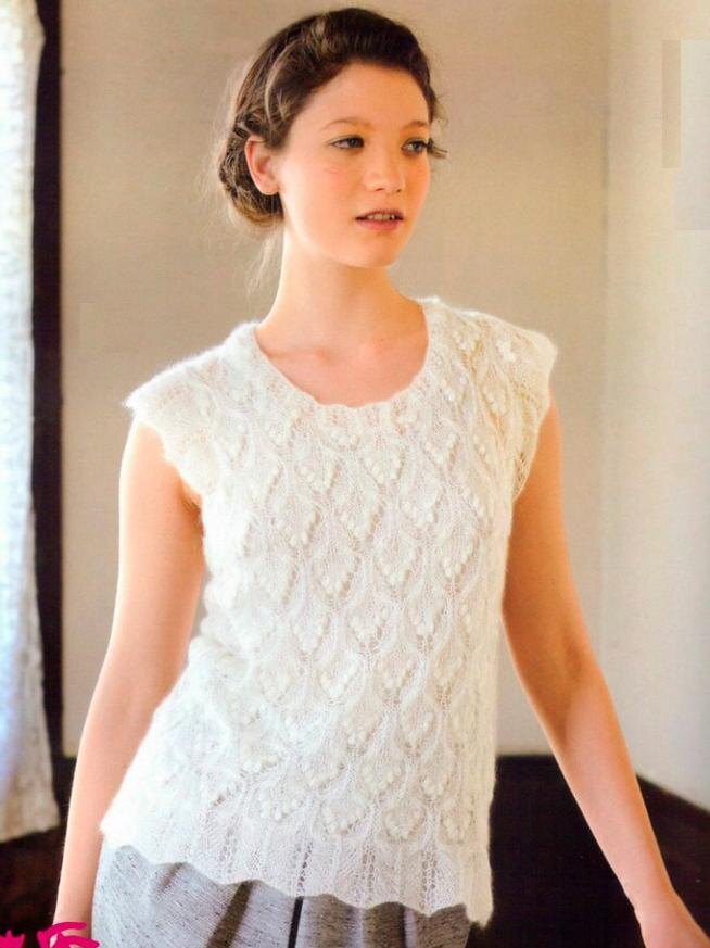 Имеется вот такое единственное фото. Топ прямого силуэта с прямыми проймами, вывязанной горловиной переда и спинки и планками. Основная часть вяжется ажурным узором с "шишечками" и косами снизу вверх. От низа корпуса, пройм и горловины вяжутся ажурные планки. Мохеровой пряжи нужно менее 100 гр. Зато 3 номера спиц нужно и крючок.