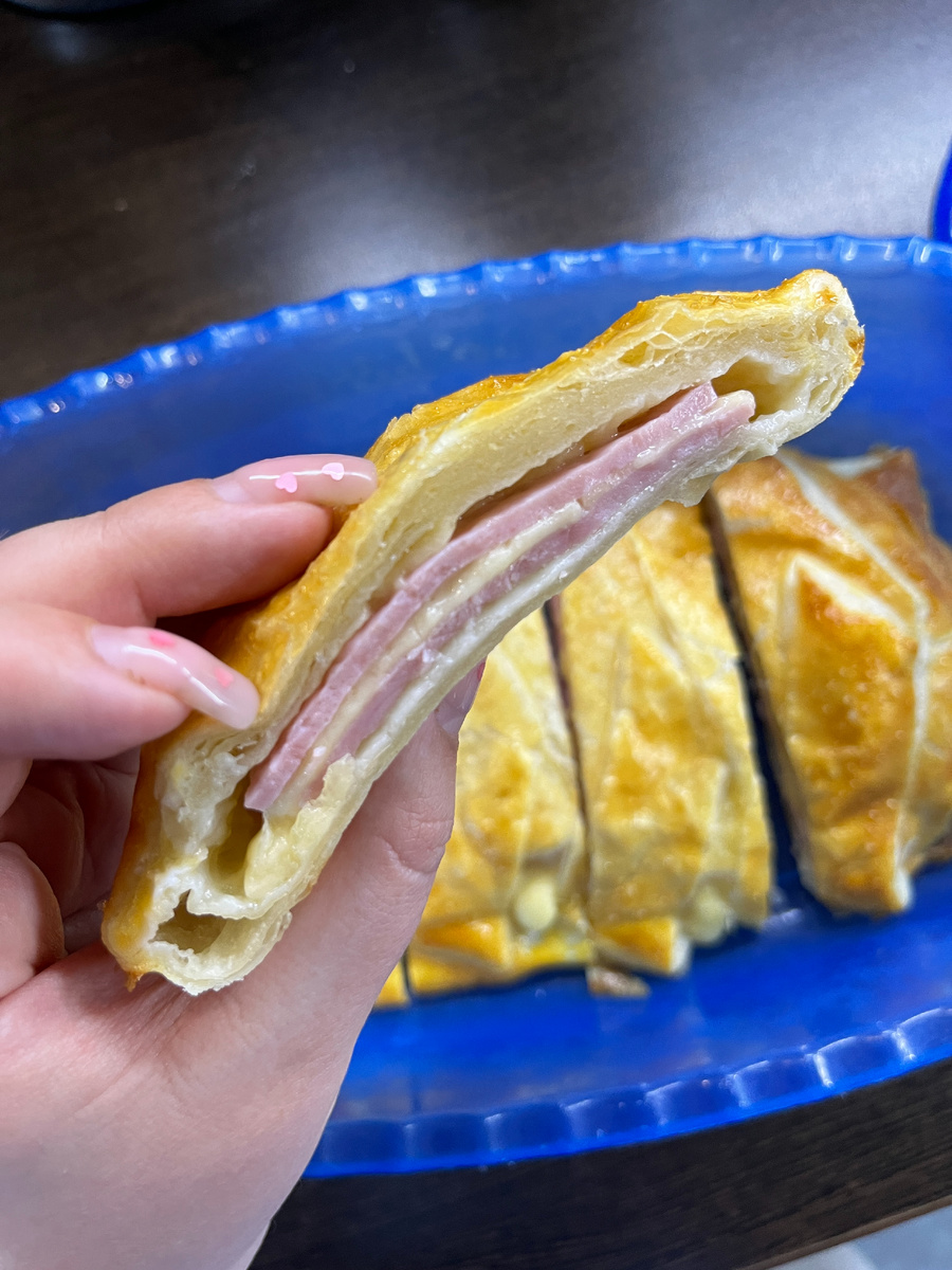 Для меня в студенчестве это была лучшая еда на свете. Недавно у меня остался кусок слоёного теста после другого блюда — и я решила не делать много маленьких слоек, а собрать одну большую. Получилось быстро, вкусно и универсально: и завтрак, и перекус, и ужин. Ингредиенты: - 1 пласт слоёного бездрожжевого теста - Ветчина — 150–200 г (в нарезке) - Сыр — 150–200 г (в нарезке) Как готовить: 1. Разогрейте духовку до 190°С. 2. Раскатайте тесто, выложите в центр сыр и ветчину. 3. По бокам сделайте надрезы полосками, как на плетёнке. 4. Закройте начинку, переплетая полоски сверху. 5. Смажьте яйцом 6. Переложите на противень и отправьте в духовку на 25 минут. Готово! Хрустящее, сытное и очень простое блюдо. Можно подать с овощами — получится полноценный приём пищи.