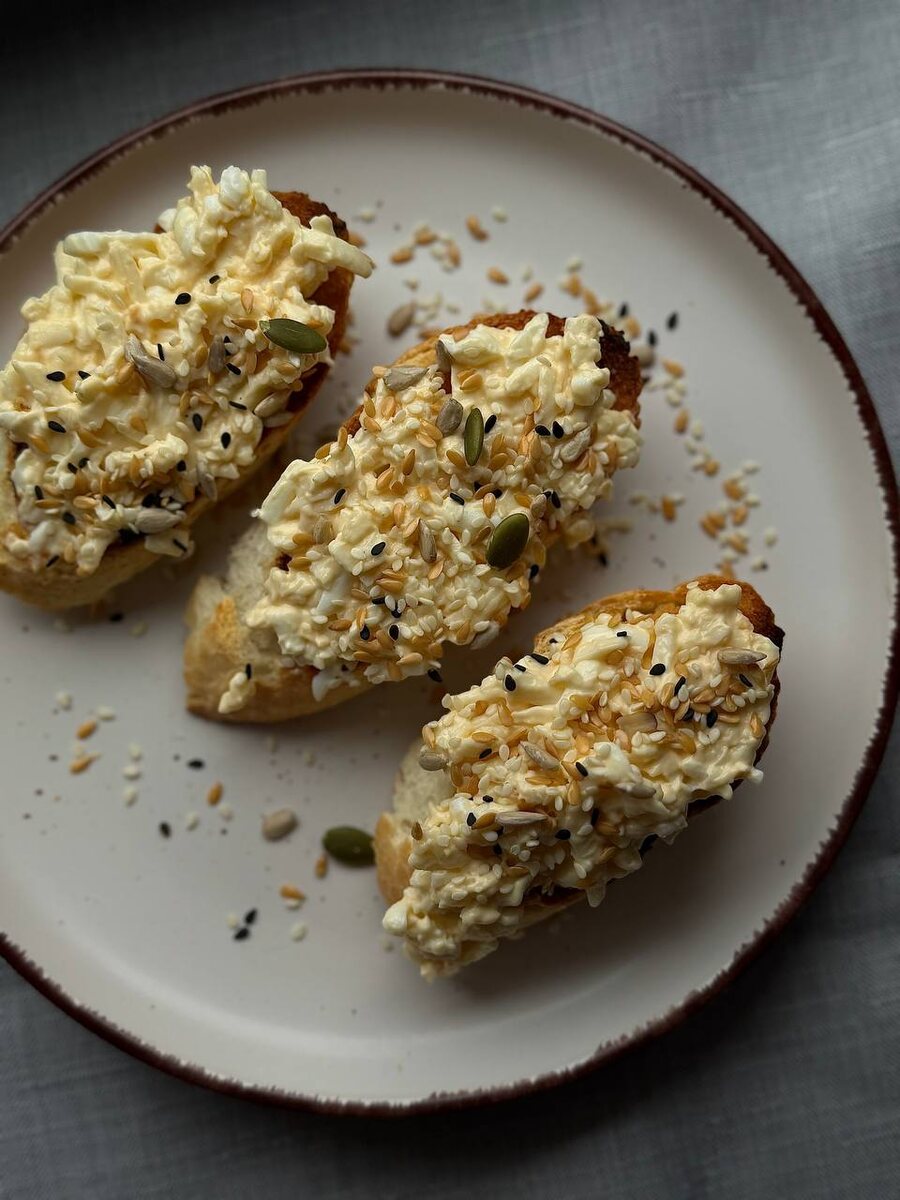 Брускетта с плавленным сыром и яйцом Багет 1 шт. Плавленный сыр 1 шт. Яйцо варенное 1 шт. Чеснок 3 дольки Майонез (без добавления сахара) Смесь из семян (для украшения) Плавленный сыр,вареное яйцо натереть на крупной терке. Выдавить дольки чеснока,добавить майонез и хорошо перемешать. Нарезанный багет подсушить на сухой сковороде. Намазываем на поджаренный багет и посыпаем смесью из семян. #полезно#пп#вкусно#брускетта