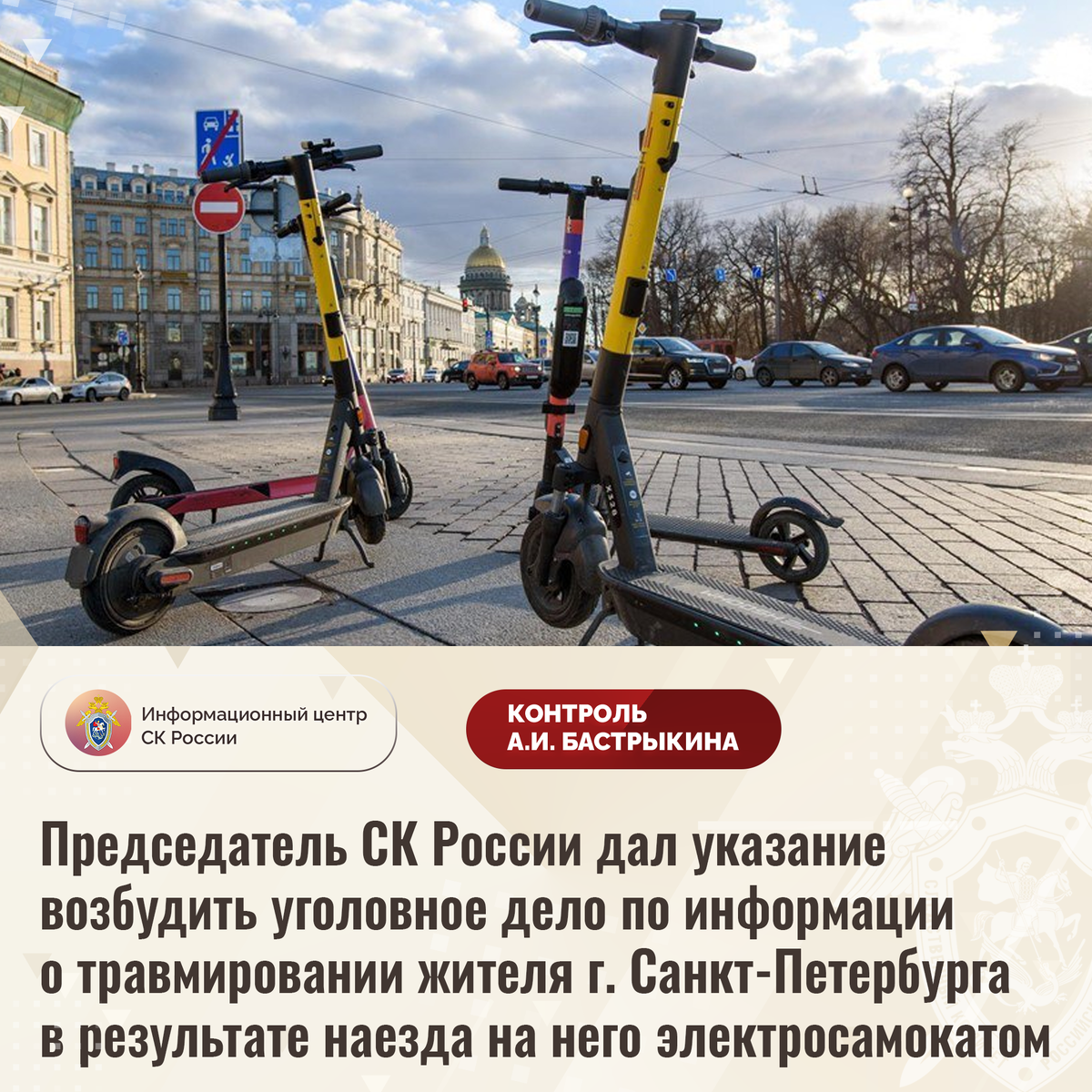 Председатель СК России дал указание возбудить уголовное дело по информации о травмировании жителя г. Санкт-Петербурга в результате наезда на него электросамокатом В СМИ сообщается, что 20 июня текущего года в городе Санкт-Петербурге женщина, управляя средством индивидуальной мобильности, сбила мужчину в пешеходной зоне, после чего скрылась с места происшествия. Пострадавшего госпитализировали с многочисленными травмами. В ГСУ СК России по городу Санкт-Петербургу по данному факту организована процессуальная проверка. Председатель Следственного комитета Российской Федерации Александр Иванович Бастрыкин дал указание руководителю ГСУ СК России по городу Санкт-Петербургу Павлу Сергеевичу Выменцу возбудить уголовное дело и представить доклад об установленных в ходе первоначальных следственных действий обстоятельствах, а по завершении расследования – о его результатах. Исполнение поручения поставлено на контроль в центральном аппарате ведомства. #СледственныйКомитет #СКРоссии #СКР #ИЦСКР #Ин