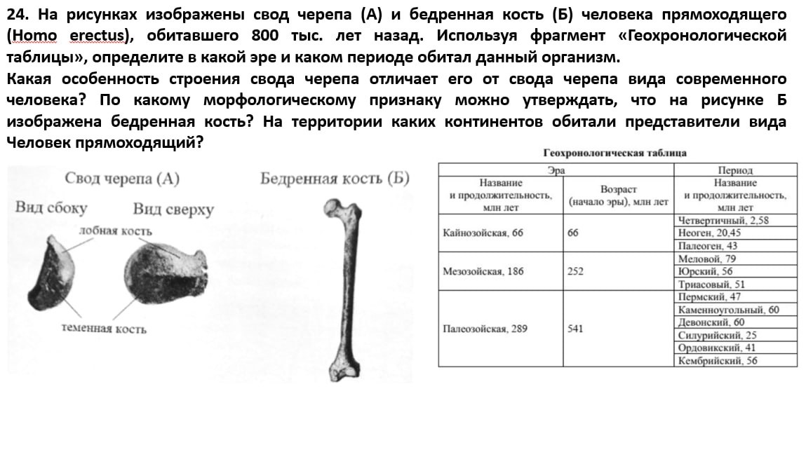 ⚠️⚠️⚠️⚠️ 1) эра - кайнозойская; период - четвертичный (должны быть указаны эра и период); 2) мощный надбровный валик (слабое развитие мозгового отдела; слабое развитие лобных долей); 3) кость трубчатая (длинная); 4) головка (эпифиз) шаровидной формы (шейка кости); 5) на территории Африки; 6) на территории Евразии.